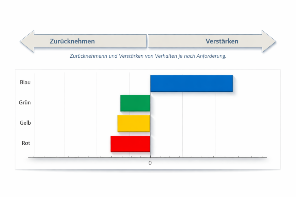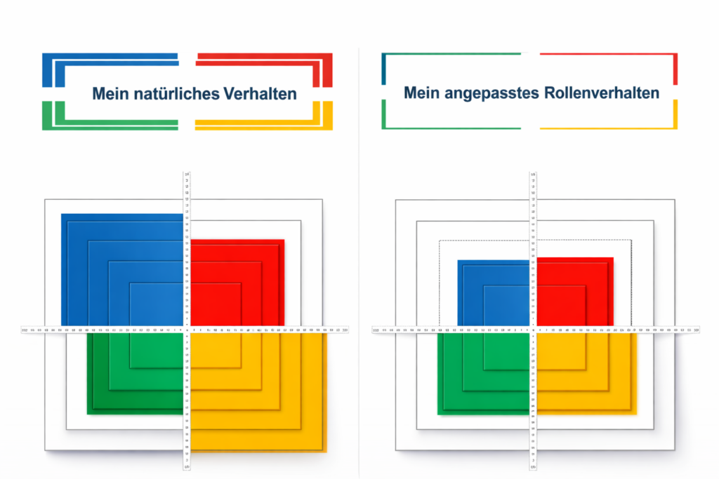 Im Ergebnis wird sichtbar gemacht, wie sich dein Verhalten in unterschiedlichen Kontexten zeigt – und wie sich natürliches Verhalten und angepasstes Rollenverhalten zueinander verhalten.