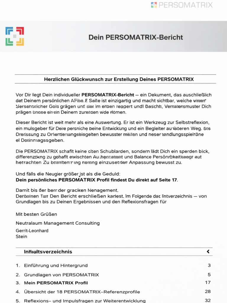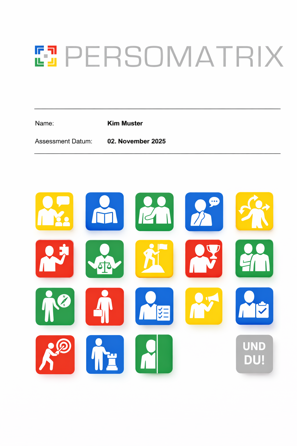 Dein PERSOMATRIX-Ergebnis ist so aufgebaut, dass du es eigenständig nutzen kannst. Es unterstützt dich dabei, dein Verhalten bewusster wahrzunehmen, einzuordnen und in Beziehung zu deinem Alltag zu setzen.